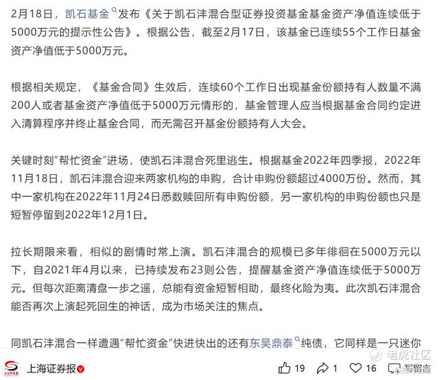 更早之前,2023年2月18日,凯石基金旗下的凯石沣混合被媒体质疑同样属于“帮忙资金”快进快出的典型代表。披时,凯石沣混合已连续55个工作日资产净值低于5000万元,距离清盘红线仅差5个工作日。然而,在关键时刻,总有“帮忙资金”进场。