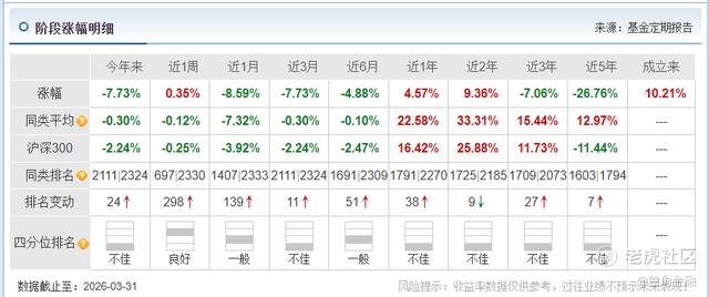 该基金2017年12月成立,近5年亏损约26%,2026年以来截至3月31日又亏损约7%,长期在同类基金中排名倒数,在此情况下,大额资金往往也会发生震荡。