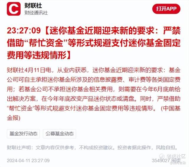 据《中国基金报》2024年4月报道,基金公司可自主承担迷你基金所涉及的信息披露费、审计费等各类固定费用;若公司不愿承担这些费用,则需在2024年6月底前给出解决方案,并在2024年年底前改变产品的迷你状态或直接清盘。同时,监管明确严禁借助“帮忙资金”等形式规避支付迷你基金的固定费用。