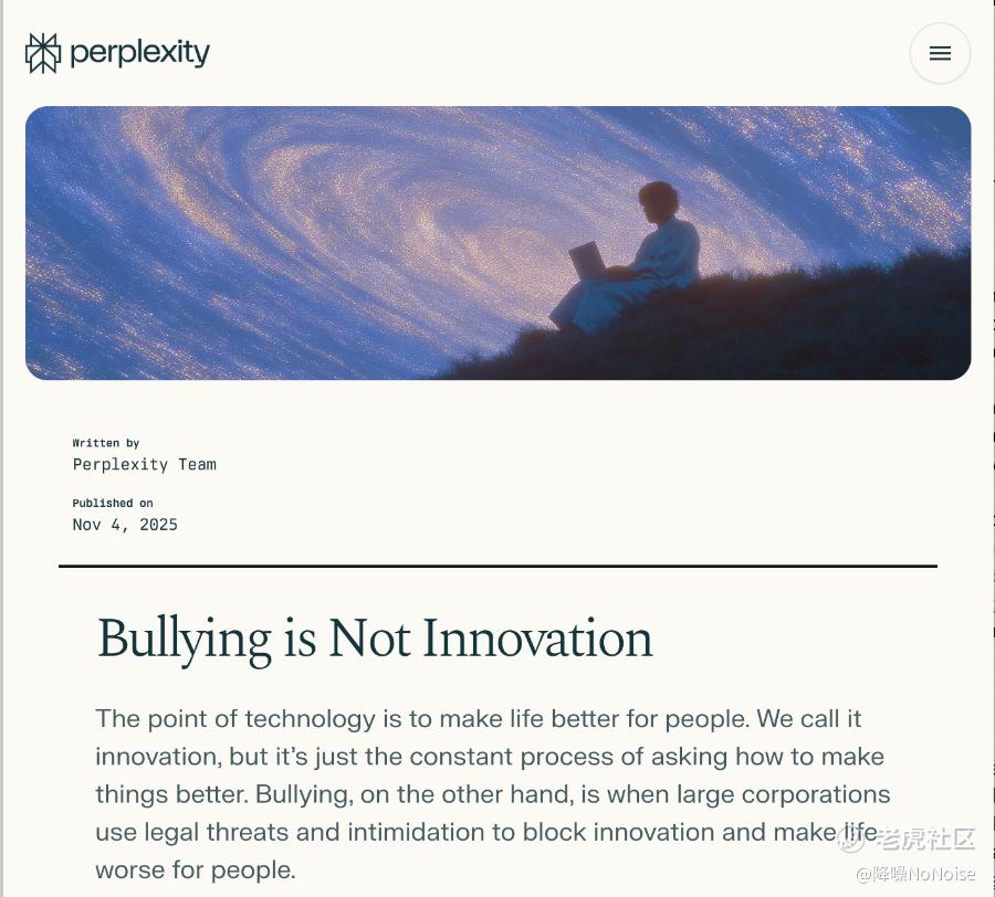 ▲Perplexity在博客更新《霸凌不是创新》,称亚马逊为「霸凌者」