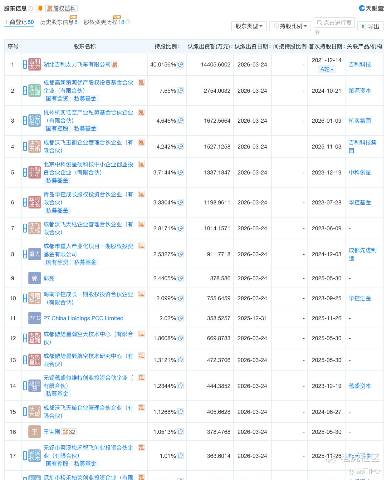 天眼查App信息显示,目前,沃飞长空控股股东为吉利科技旗下湖北吉利太力飞车有限公司,持股40.0156%。