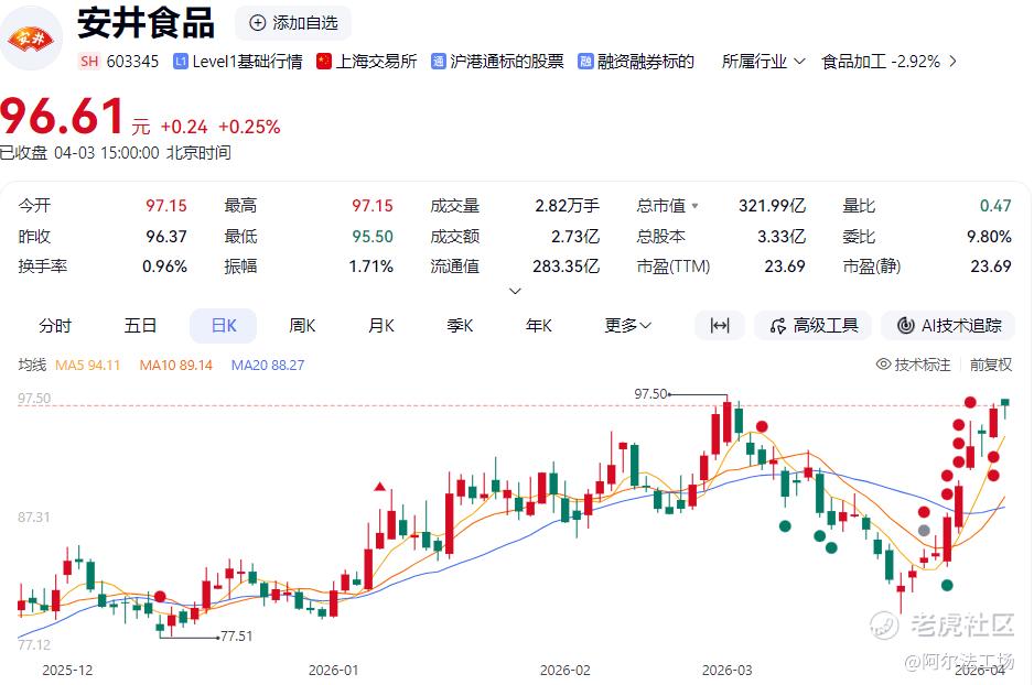 有“预制菜之王”“冻品一哥”之称的 $安井食品(02648)$ 一波“九阳神功”直接带飞股价,从3月23日至4月3日,安井食品“9连阳”后“10连阳”,股价从81.3元/股一路抬升到96.61元/股,总市值达322亿元。