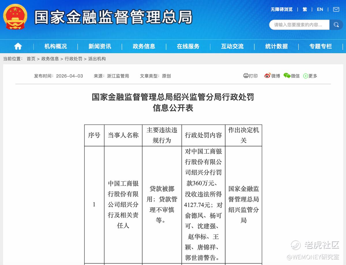 4月3日,国家金融监督管理总局绍兴监管分局行政处罚信息公开表显示,工商银行绍兴分行,因贷款被挪用;贷款管理不审慎等,被罚款360万元、没收违法所得4127.74元;对俞德风、杨可可、沈建强、赵华标、王颖、唐锦祥、郭世清警告。