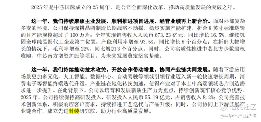 长期以来,半导体产业链遵循着“设计-制造-封测”的清晰分工,晶圆代工厂专注前道工序,封测厂负责后道工序。然而,随着摩尔定律逼近物理极限,这一界限正在被彻底打破:中芯国际在2025年年报中披露成立先进封装研究院。