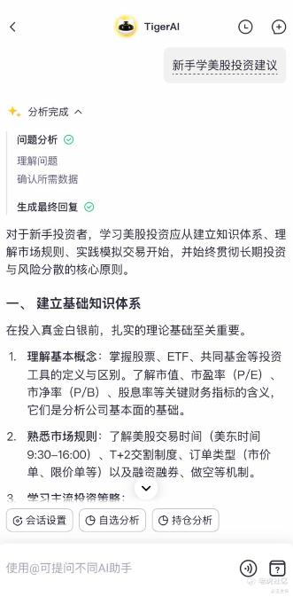 我下载好APP,看着界面上各种认识的,不认识的英文华文术语,又是一阵头晕。但小孩早就准备好了,他给我列了一个长长的学习清单。还教我们怎么问AI,就是老虎证券里面的那个AI,免费问,答案很长,孩子说这个AI回答投资方面的问题,是这个行业的领头级。