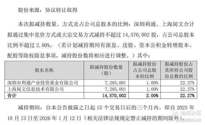 2025年9月12日,中文在线在深交所发布关于大股东股份减持计划预披露的公告。公告显示,腾讯系关联股东深圳市利通产业投资基金有限公司(以下简称“深圳利通”)、上海阅文信息技术有限公司(以下简称“上海阅文”)计划自本公告披露之日起15个交易日后的三个月内以集中竞价方式或大宗交易方式合计减持公司约1457.00万股,拟减持股份占公司总股本比例的2%。