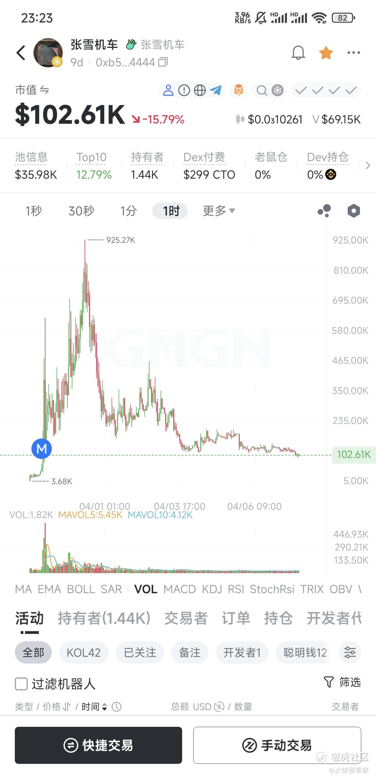 最近张雪机车火了,下意识的看了一下链上的Meme,果然跑出了金狗。张雪机车的市值,2天时间从30k涨到900k,最高翻了30倍,目前已经回落了。
