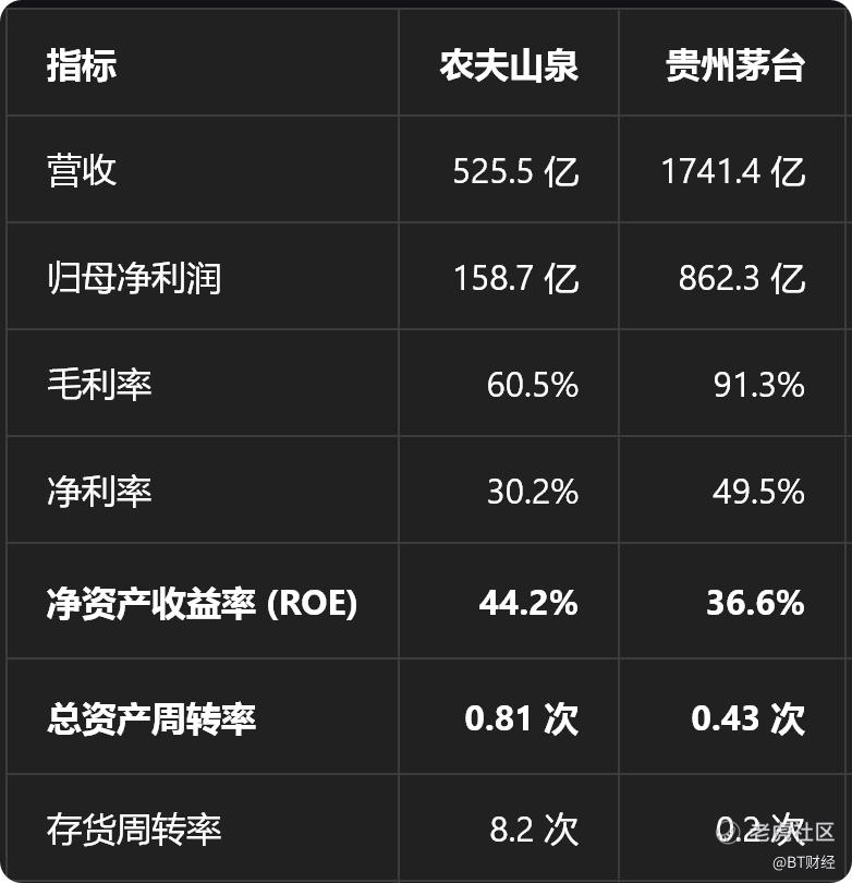 农夫山泉的轻资产、高周转让其资本效率ROE远高于茅台,茅台净利率更高,但周转率太低,被农夫山泉的快周转+适度杠杆反超,最终ROE更低。