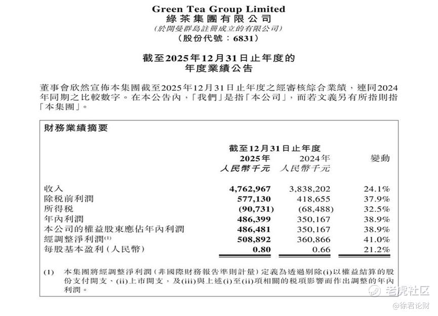 3 月 23 日,绿茶交出上市后首份完整年报,数据相当扎实。2025 年全年营收 47.63 亿元,同比增长 24.1%;净利润 4.86 亿元,同比大增 38.9%,经调整净利润更是涨了 41%,达到 5.09 亿元,净利率提升至 10.7%。在餐饮行业竞争激烈、不少品牌还在收缩的背景下,绿茶能实现营收利润双高增,实属难得。