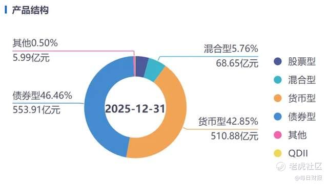 截至2025年末,其货币基金规模达到510.88亿元,占总规模比重42.85%,较2025年三季度末增加329.83亿元,仅1个季度就带动规模显著增长。此外,其债券基金规模为553.91亿元,较2025年三季度末增加36.24亿元。