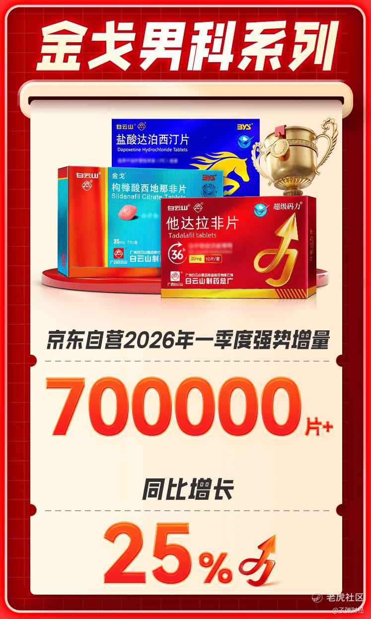 行业数据显示,2025年上半年,京东和美团两大电商平台上,金戈的销售总额已超过3.8亿元。进入2026年,金戈在电商渠道的增长势头依然强劲。数据显示,2026年第一季度,金戈男科系列产品在京东自营的销量较去年同期增加高达70万片,同比增长达25%,线上渠道正持续成为品牌增长的“第二曲线”。
