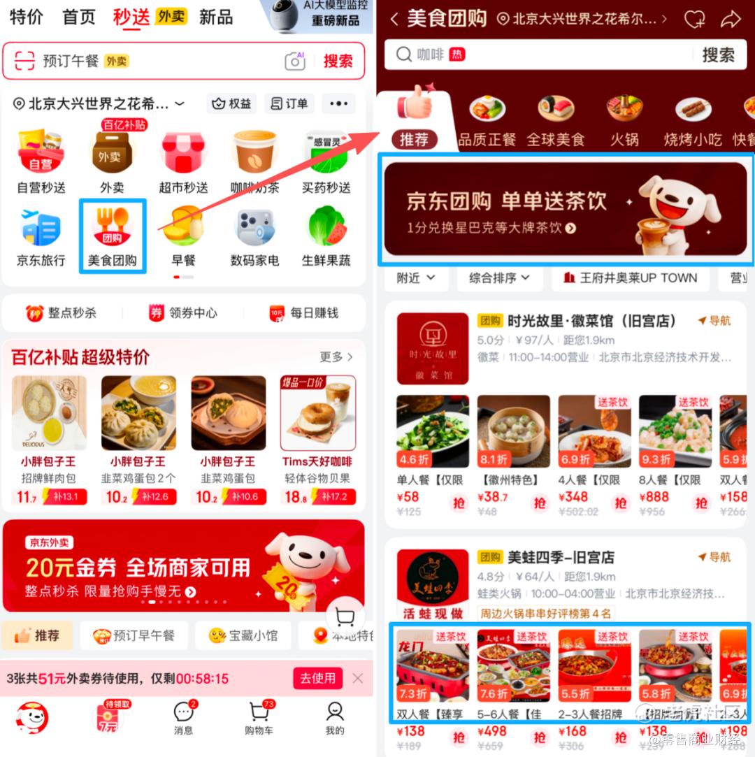 战略层面,京东没有单独推出团购APP,而是将“美食团购”板块直接嵌入主APP“秒送/外卖”核心入口,与外卖、自营秒送、超市秒送等业务同场呈现,同时拿出百亿餐饮补贴、“单单送茶饮”等重磅运营动作,全面加码到店消费赛道。