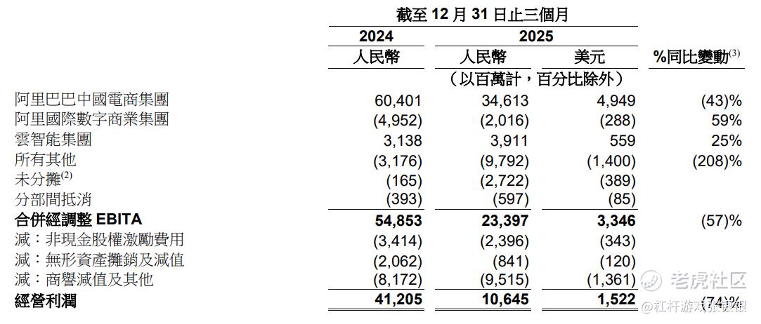 基于此,叠加战略投入的增加,商誉减值、股权激励费用的增长等等。导致阿里2025年第四季度经营利润同比大跌74%到106.45亿元,净利润同比跌66.3%为156.31亿元;经调整EBITA同比跌57%为233.97亿元。