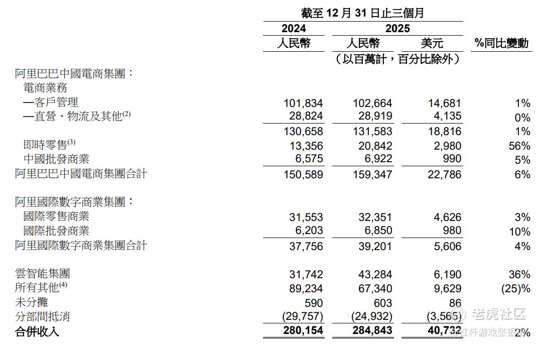 从核心财务数据来看,阿里2025年第四季度的表现可以说是冰火两重天。火的是AI,冰的是传统电商业务。