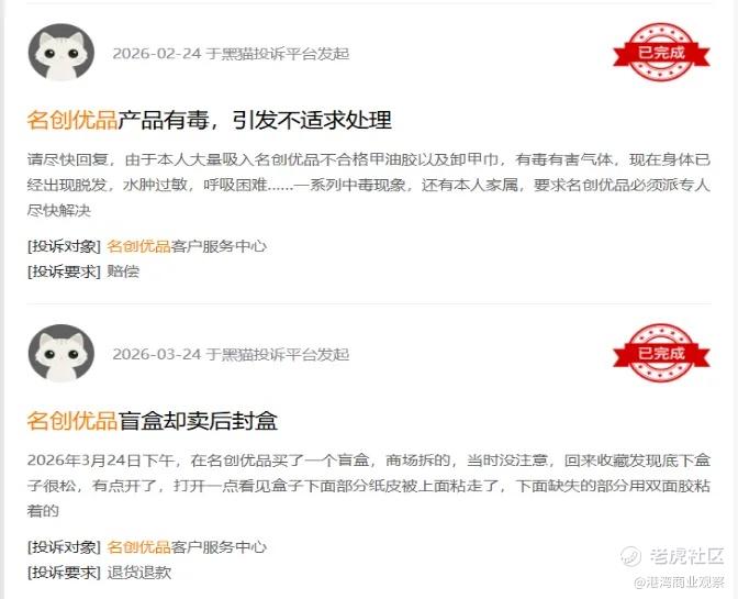 截至2026年4月7日,在黑猫投诉平台上检索“名创优品”出现4777条投诉情况,含产品质量问题、售后不佳和返利金争议等;检索“TOP TOY”出现959条投诉,包含产品损坏、广告误导、虚假宣传等。两大品牌的投诉情况,也从侧面反映出其在经营服务过程中仍存在诸多待改进之处。