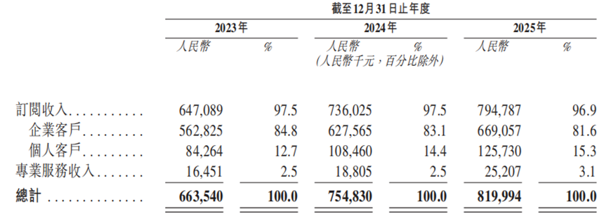收入来源上,群核科技建立了多元商业模式,包括订阅制、专业服务收入,以及公司正在探索的token收费模式。订阅模式是公司的主要收入来源,收入稳定且可持续性强,2023至2025年订阅收入分别为6.47亿元、7.36亿元、7.95亿元,占总营收比例始终维持在95%以上。从客户类型上看,企业客户是收入支柱,2025年企业客户订阅收入6.69亿元,占总收入的81.6%,而个人客户订阅收入持续增长,2025年达到1.26亿元,占总收入的比例提升至15.3%,同时,个人客户的付费转化率逐年提升,从2023年6.8%提升至2025年9.6%。随着个人用户规模和付费转化率的提升,个人客户贡献的收入占比也有望持续提升。