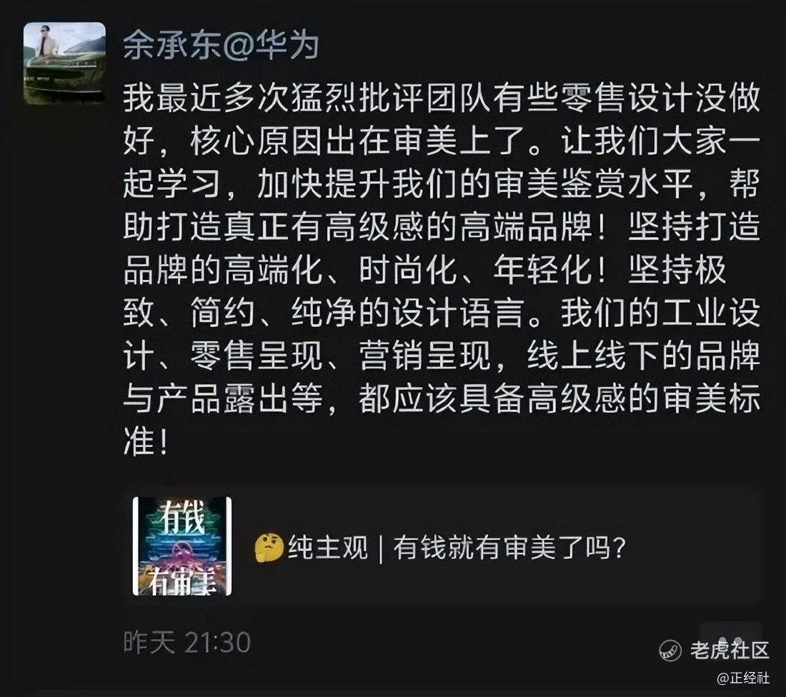 余承东的激烈反应,与其说是个人审美偏好的一次宣泄,不如说是**高端化战略进入深水区后必然经历的阵痛。【《新商悟》出品】