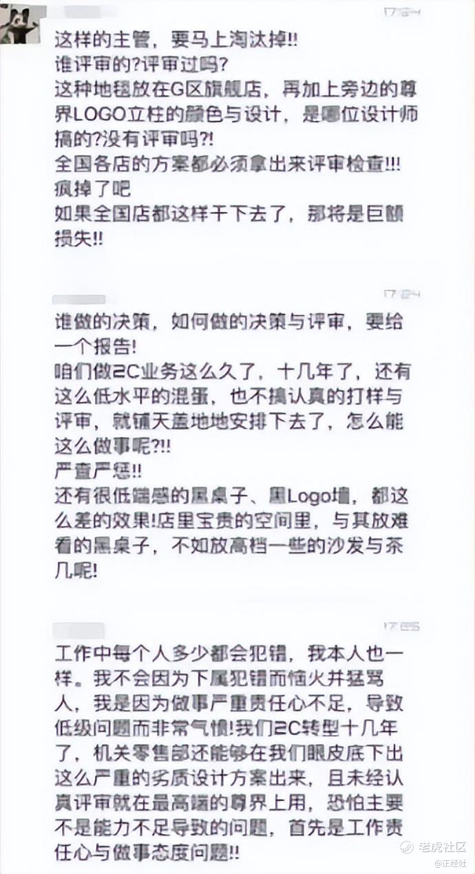 他在工作群中怒斥相关工作人员:这并非单纯的能力不足,而是严重的责任心缺失。他说:“我因做事严重责任心不足,导致低级问题而非常气愤!”在他看来,**转型消费者业务已有十几年,零售部门却在眼皮底下拿出劣质方案且未严格评审,这是态度问题。