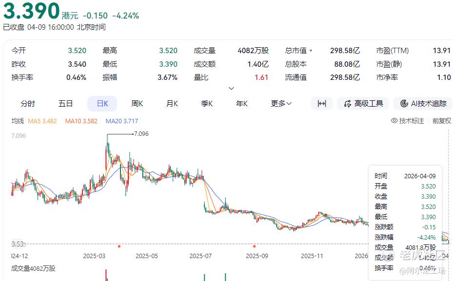 截至4月9日收盘,中国飞鹤港股报价3.39港元/股,是2025年以来新低,相较2021年高位约24.06港元/股,累计跌幅约86%,总市值更是跌破300亿,仅约298.6亿港元。