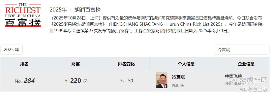 东方财富网显示,中国飞鹤董事长冷友斌持有公司49.38%的权益股份,按此计算,冷友斌可分到公司大部分分红。《2025年·胡润百富榜》显示,冷友斌个人财富220亿元,位列榜单第284位。