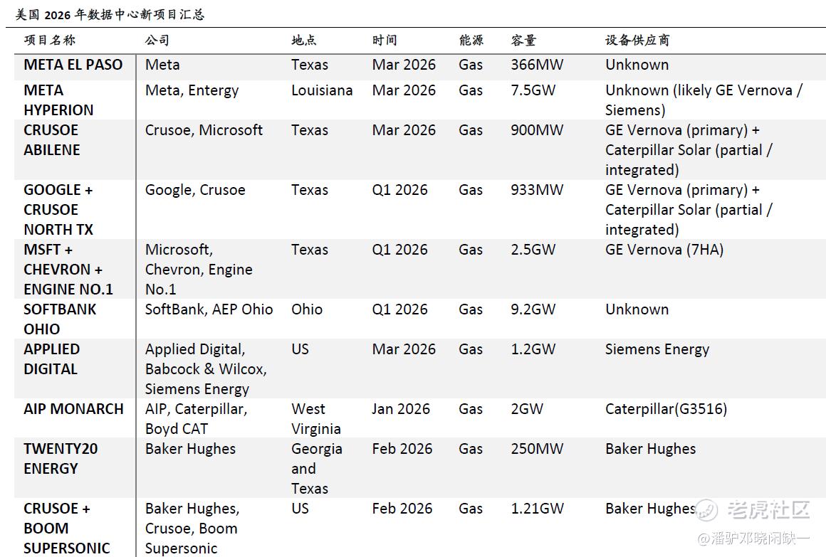 2026 年 Q1 美国 AI 数据中心新增装机超 20GW,算力扩张的核心约束,已经从芯片转向了电力。 Meta、微软、谷歌、软银的头部项目,全部锁定天然气自备发电,GE Vernova 拿下核心订单,卡特彼勒、西门子能源分食剩余份额。 能源获取能力,正在成为 AI 算力厂商的核心护城河。