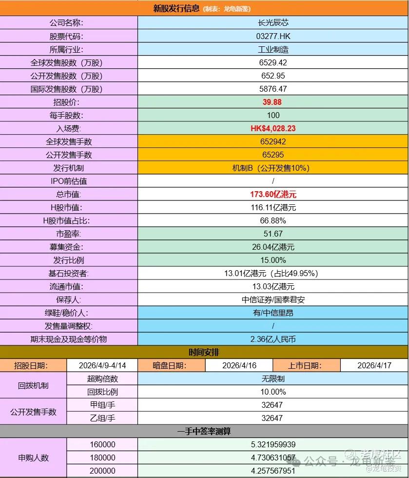 本次全球发售股数6529.42万股,每手股数100股,招股价39.88港元,入场费4028.23港元,采用机制B发行,公开发售手数65295手,预计16-20万人参与,一手中签率5%左右,申购500手稳一手。