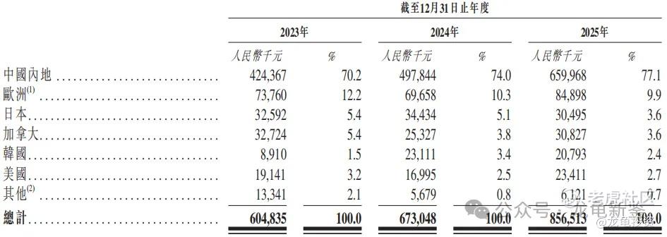 按区域划分收入,主要营收来源于中国内地份额占比77.1%、欧洲9.9%、日本3.6%、加拿大3.6%、韩国2.4%、美国2.7%;收入大头以内地为主,详细明细见下图。