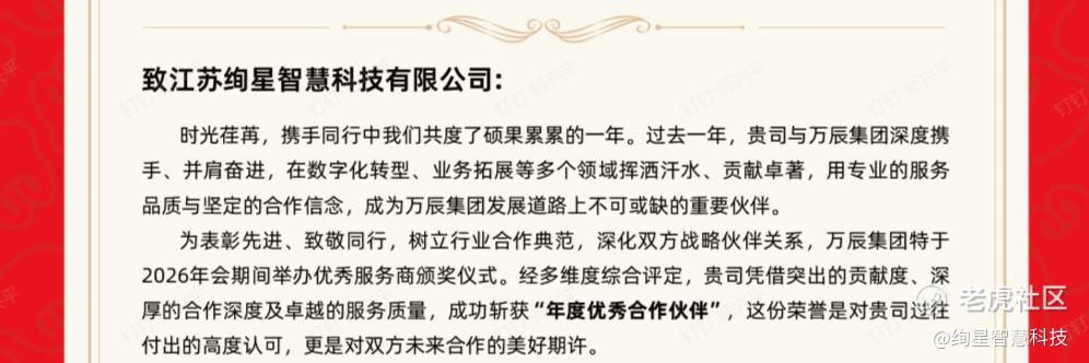 “贵司凭借突出的贡献度、深厚的合作深度及卓越的服务质量,成功斩获此殊荣。这份荣誉是对贵司过往付出的高度认可,更是对双方未来合作的美好期许。”
