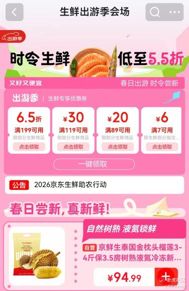 这个春天,想要轻松筹备一场美味又经济的户外野餐,锁定京东生鲜“今日最便宜”,让真低价、好品质融入你的日常三餐与休闲时光。