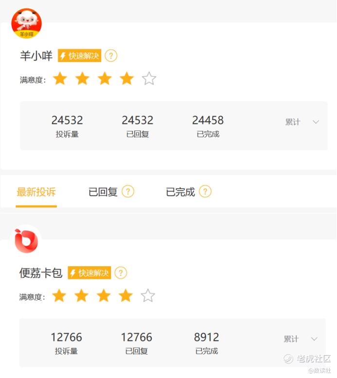便荔卡包同样高达12766条,除了投诉高利贷、催收等指控,也掺杂着对羊小咩、以及双方深度捆绑合作的投诉。