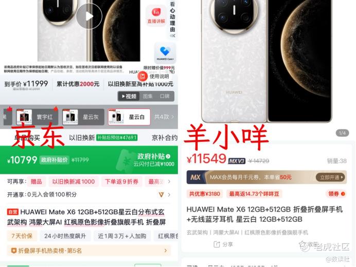 以**Mate X6(12+512)手机为例,其在京东上国补前售价为11799元,而在羊小咩平台同样配置的手机售价却为14729元,差价高达2930元。两者唯一的区别在于羊小咩平台搭配了一款无线蓝牙耳机。
