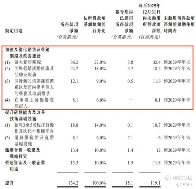 数据显示,公司于2025年5月30日成功于联交所主板上市后在扣除应支付的包销佣金、奖励及其他发售开支后,从全球发售中收取的所得款项净额约为1.34亿港元。其中,约0.81亿港元、占总所得款项净额的60%资金,将全部用于加强及优化销售及营销网络及改善服务;用于提升研发能力、改善技术基础设施及合并收购战投等方面的资金投入合计仅有0.54亿港元,占比40%。