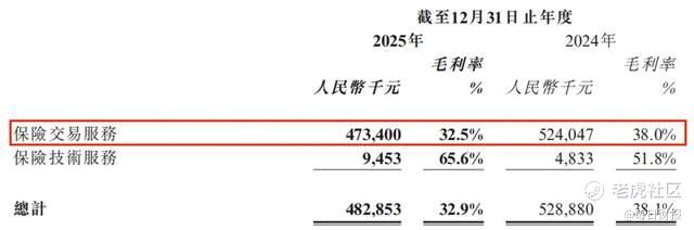 2025年,手回集团整体毛利为4.83亿元,同比减少8.7%。更为严峻的是,整体毛利率从2024年的38.1%骤降至32.9%,收缩达5.2个百分点。作为核心收入来源的保险交易服务,其毛利率亦从38.0%下降至32.5%,减少了5.5个百分点。公司在财报中解释称,主要是由于为应对“报行合一”政策导致的行业费率调整,并抢占长期重疾险等关键市场,主动加大了对持牌经纪合作伙伴及自媒体流量渠道的佣金与推广投入。