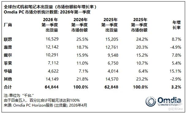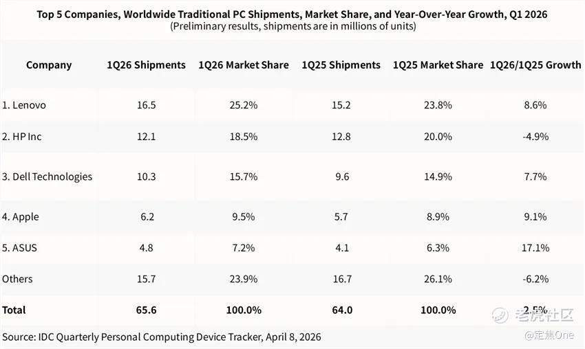 4月8日IDC公布的数据显示,2026年Q1,全球PC出货量约6560万台,同比增长2.5%;同期Omdia给出了3.2%的增速,对应约6480万台出货。两家机构的数字略有差异,但结论一致:PC市场在开年又涨了一把。