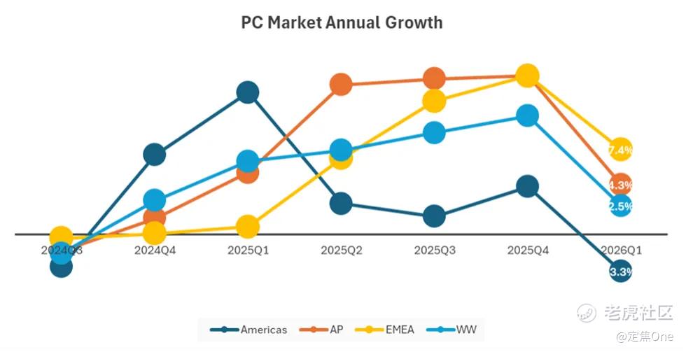 2025年Q3,全球PC市场的增速已经不低,“有‘低基数’加‘集中换机’的因素”,据PC从业者李泽分析,一方面,疫情期间透支的换机需求,导致此前基数较低,另一方面,Windows 10停止支持的时间表,迫使不少机构集中更新设备。