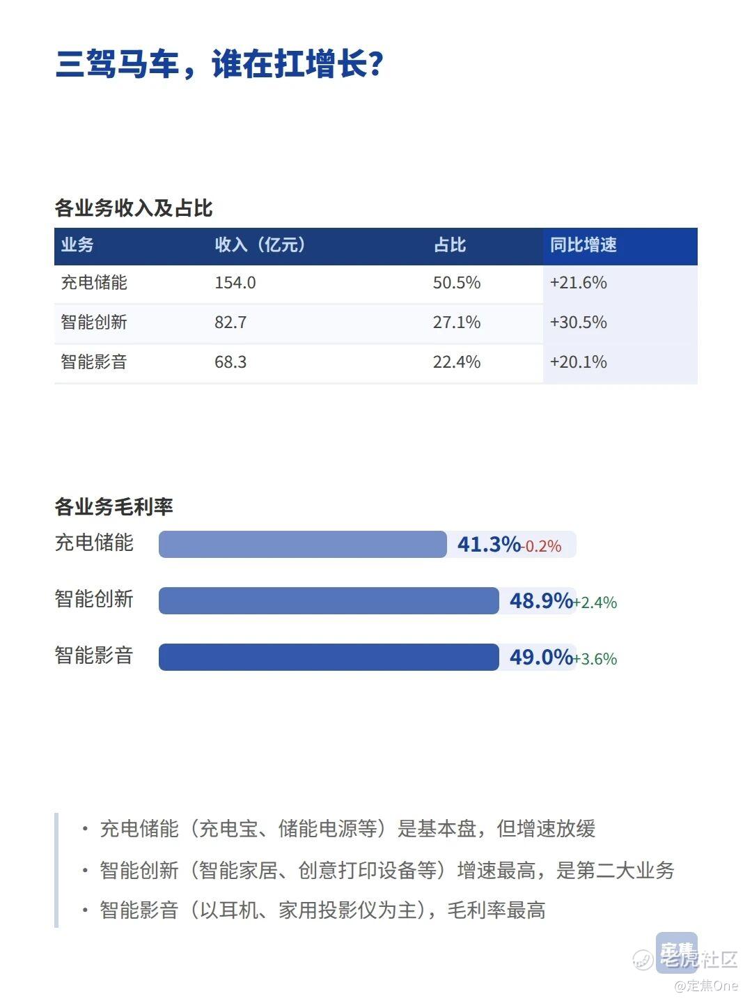 智能影音类全年收入68.3亿元,同比增长20.1%,占总营收22.4%。soundcore耳机在苹果、索尼夹缝中求生,家用投影市场整体疲软,板块增速垫底。