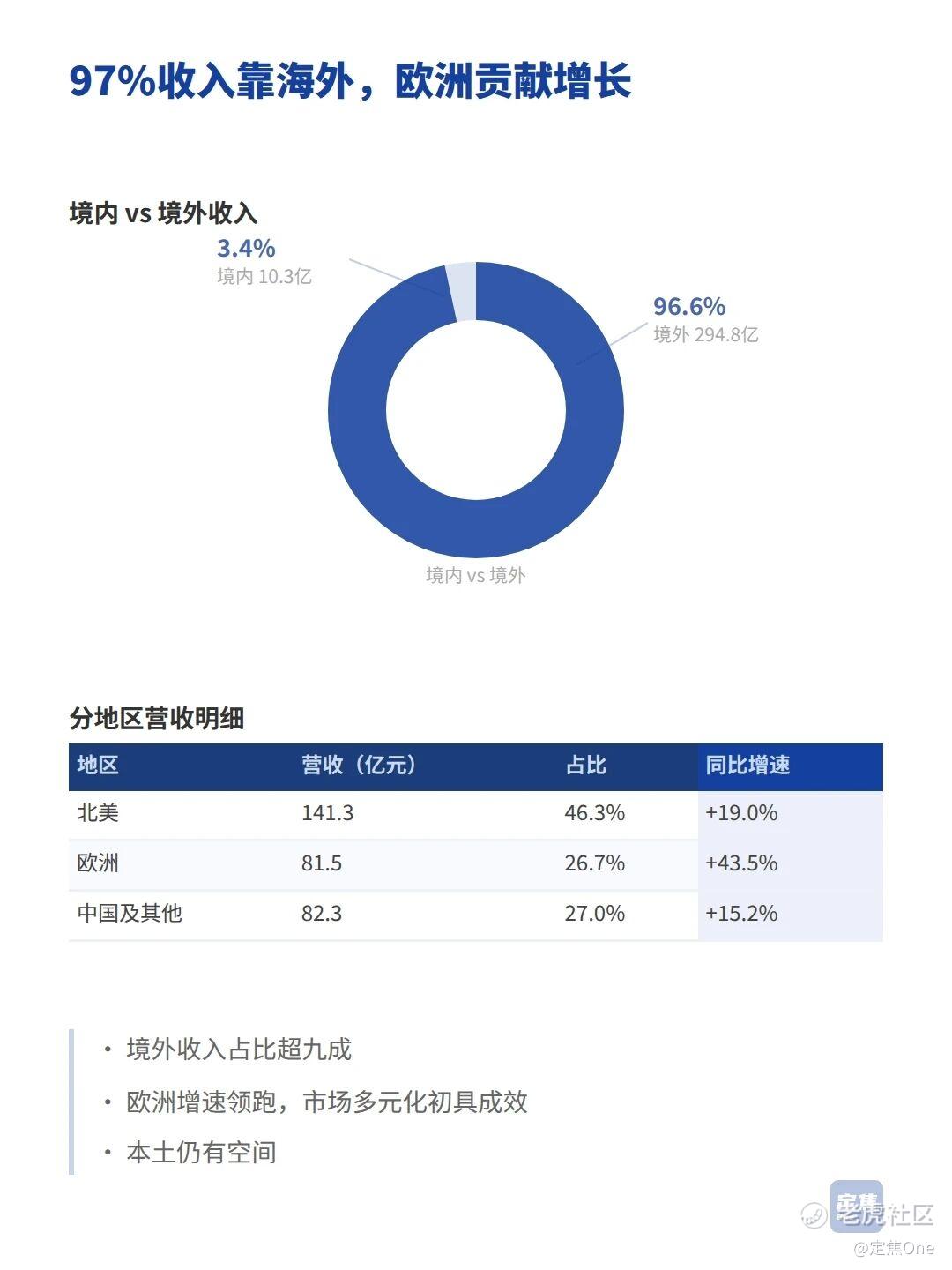 境外市场上,欧洲成为增长亮点。全年收入81.5亿元,同比增长43.5%,占比增长至26.7%。