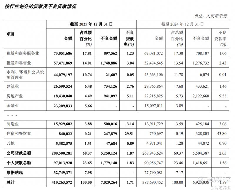 如下图所示,除房地产业务外,占据该行“公司贷款”最多的租赁和商务服务、批发和零售、水利环保、建筑以及制造业5大门类,其不良金额与不良率均有一定幅度的提升。