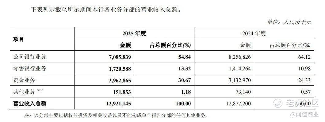 2025年,郑州银行零售银行业务营收同比大增22%至17.2亿元。但短期内,零售银行业务或许很难抵消了对公业务萎缩,前者13.32%的营收只占不仅远低于公司银行业务,甚至亦不足资金业务(占比30.67%)一半。