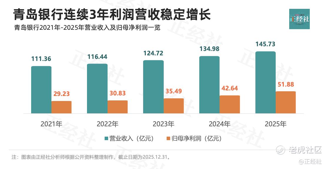 青岛银行的2025年终考成绩单相当亮眼:实现营收145.73亿元,同比增长7.97%,在已经公布年报的A股上市城商行中,同比增速仅略低于南京银行(10.48%)和重庆银行(10.48%),但高于宁波银行(8.01%)和大部分营收微增甚至下滑的银行;实现归母净利润51.88亿元,同比增长21.66%,位居已经公布年报的A股上市城商行首位。