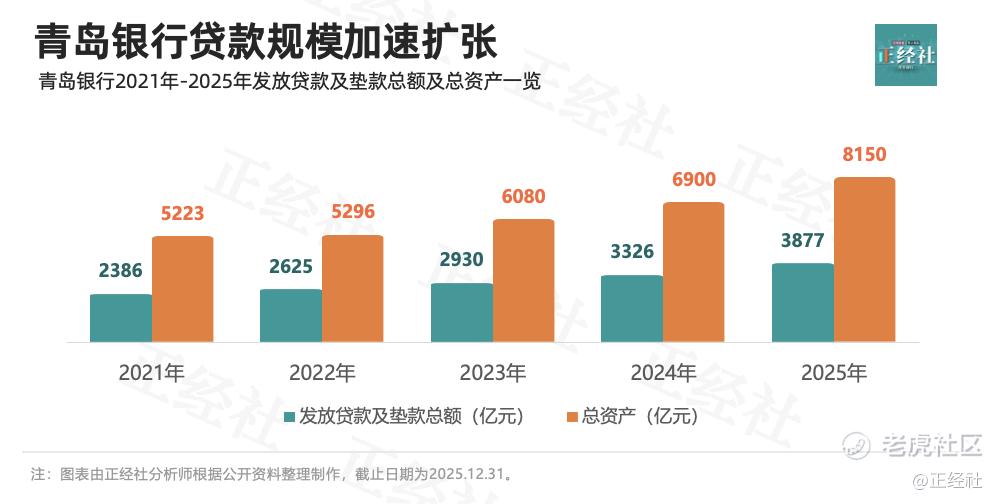 根据年报提供的数据,2021年至2025年,青岛银行发放贷款及垫款总额分别为2386.09亿元、2625.19亿元、2929.93亿元、3325.54亿元、3876.93亿元,同比增速分别达17.91%、10.02%、11.61%、13.50%、16.58%。常年保持两位数增长,而且2023年以后成加速度增长。