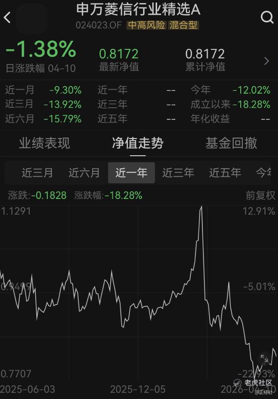 同花顺数据显示,截至2026年4月10日,今年以来,申万菱信行业精选A已累计下跌12.02%,单位净值仅剩0.8172元。也就是说,成立刚满10个月,这只基金已经跌去了超过18%。而同期,基金业绩比较基准上涨了14.37%,沪深300指数上涨了20.74%。在Wind同类产品中的排名为4961/5058,稳稳蹲在倒数梯队,几乎垫底。