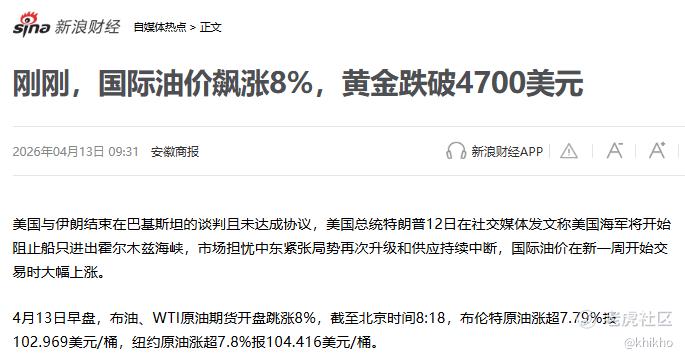 今天,也就是2026年4月13日,美伊和谈正式破裂,美国宣布对霍尔木兹海峡实施海军封锁,全球金融市场在新一周开盘即陷入剧烈震荡。按照传统避险逻辑,这种级别的地缘冲突升级理应推动黄金价格飙升,然而市场却给出了截然相反的答案:美元指数一度上涨0.47%至99.19,迅速收复此前跌幅,而黄金却在通胀预期升温与央行政策转向的双重压力下暴跌。也是醉了。[喷血]