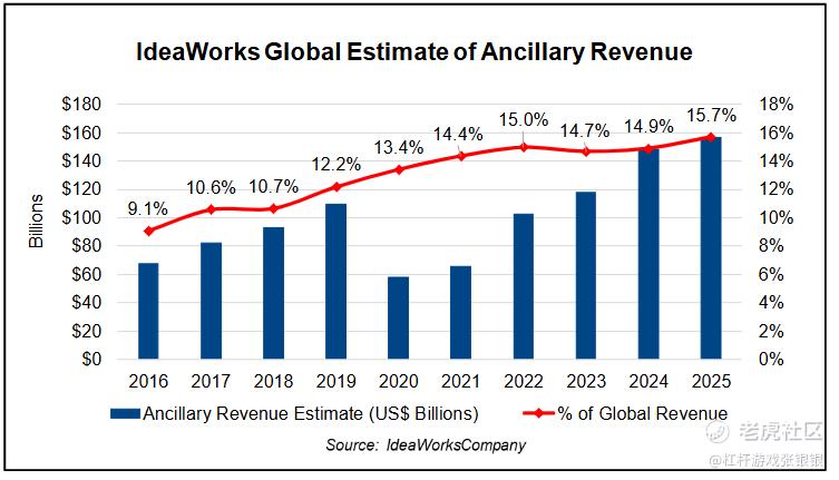 行业整体来看,辅助业务收入对航司也是越来越重要。最新数据显示,2025年全球航空辅助收入预计达1570亿美元,占行业总收入的15.7%。