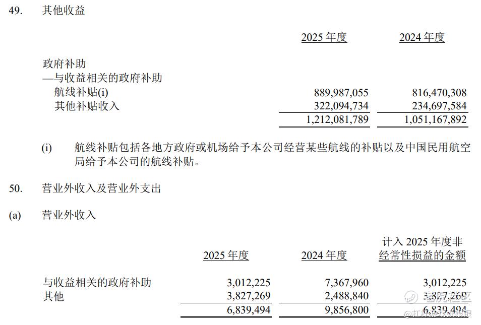 另外值得一提的是,2025年春秋航空航线补贴收入8.90亿元,其他补贴3.22亿元,加上营业外收入中的0.30亿元,政府补贴合计约12.42亿元,占利润总额的约41%。