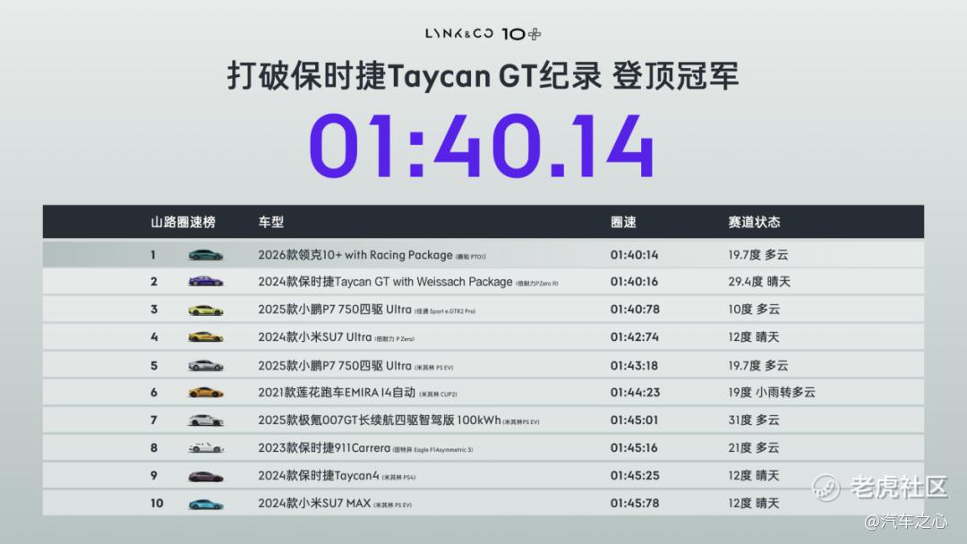 一方面,领克 10+以 1′40′14 的成绩打破了保时捷 Taycan Turbo GT 的记录,登顶亚洲山脊赛道圈速榜第一。