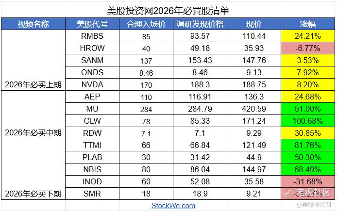 正式开始之前,我们先回顾2026 年初推介的必买十只股,推介了14家公司,11只上涨,3只下跌,准确率79%;其中,有五只涨幅达到50%, GLW 龙头股上涨100%.