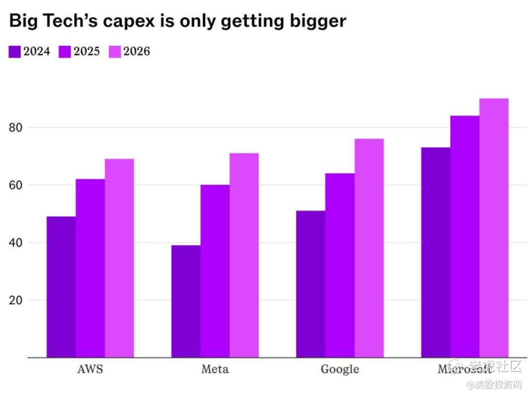 今天,类似的“先修路、先占位”逻辑,正在 AI 身上以更大的量级重演。到 2026 年,四大科技巨头预计将投入 6500 亿美元用于 AI 基建,比 2025 年高出接近 60%;微软 FY2026 Q2 单季资本开支就达到 375 亿美元,其中约三分之二直接投向了 GPU 和 CPU。