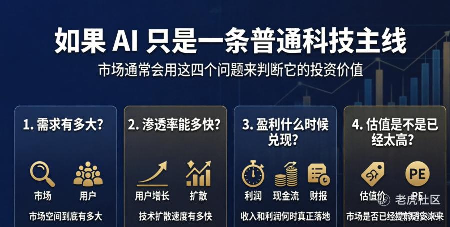 如果 AI 只是一条普通科技主线,那分析方法其实并不复杂。无非就是看需求有多大、渗透率能爬多快、盈利什么时候兑现、估值是不是已经太高。这套逻辑,市场过去分析互联网、云计算、新能源的时候,早就用得很熟了。