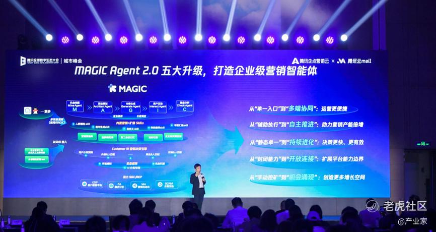 他是腾讯营销与交易产品商业化总经理,负责腾讯企点营销云和腾讯云mall客户的对接服务。就在采访的一个小时前,腾讯企点营销云在腾讯云上海城市峰会上正式发布MAGIC Agent 2.0版。